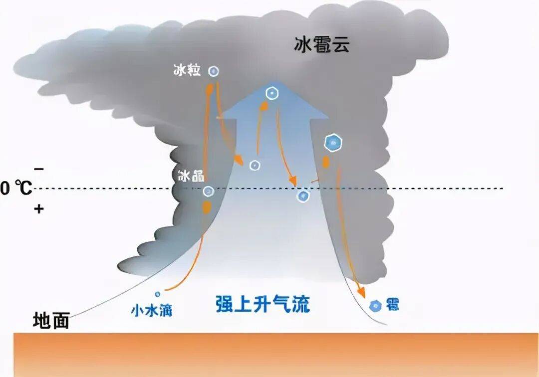 4.过冷水与冰晶累积:积雨云内含水量丰富(3-8克/立方米),在最大上升速度上方存在“过冷却水累积带”,冰粒在此反复碰撞过冷水滴,逐渐增大。