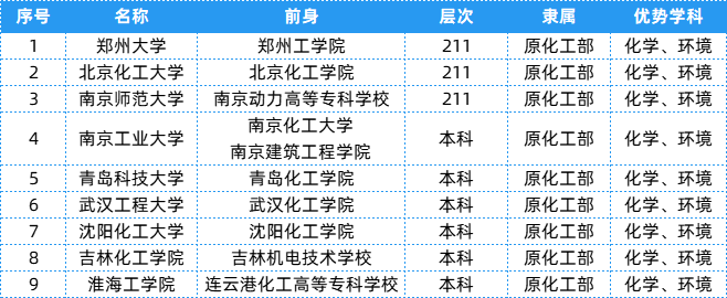 化工部相关院校共有9所,层次、隶属及优势学科等具体信息可以参考下表~