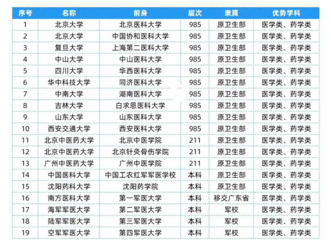 医学类相关院校共有19所,层次、隶属及优势学科等具体信息可以参考下表: