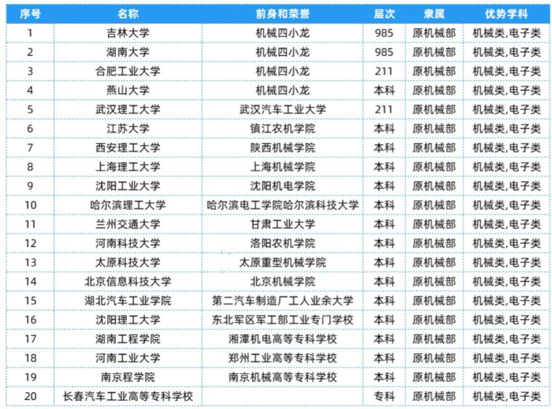 机械部相关院校共有20所,层次、隶属及优势学科等具体信息可以参考下表~