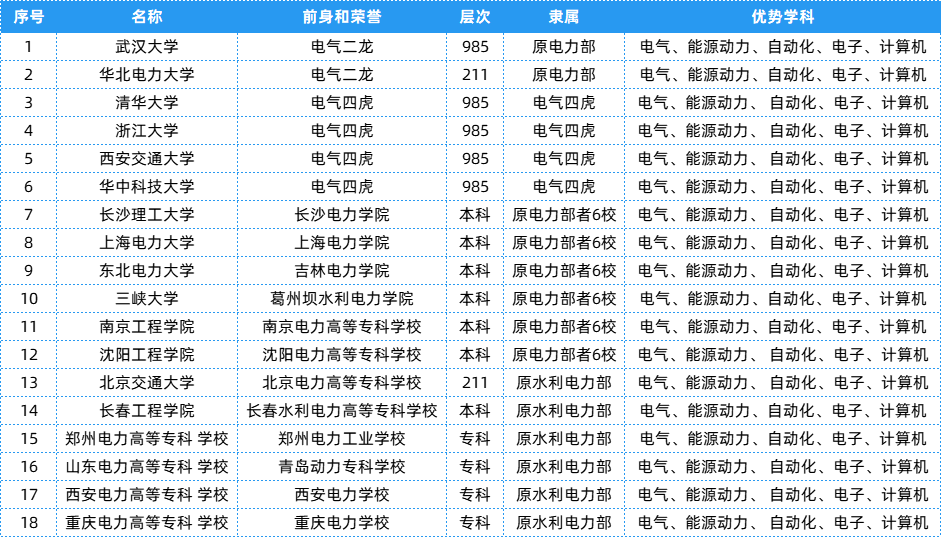 电力部相关院校共有18所,层次、隶属及优势学科等具体信息可以参考下表~