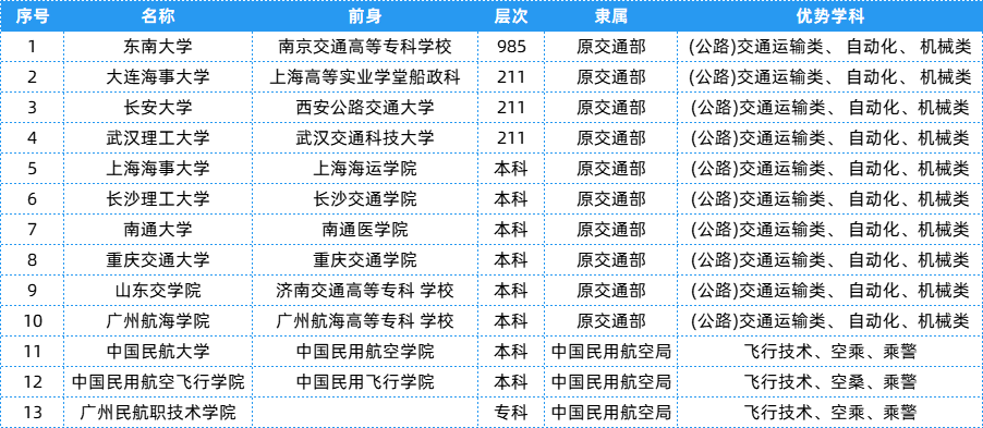 交通部相关院校共有13所,层次、隶属及优势学科等具体信息可以参考下表~