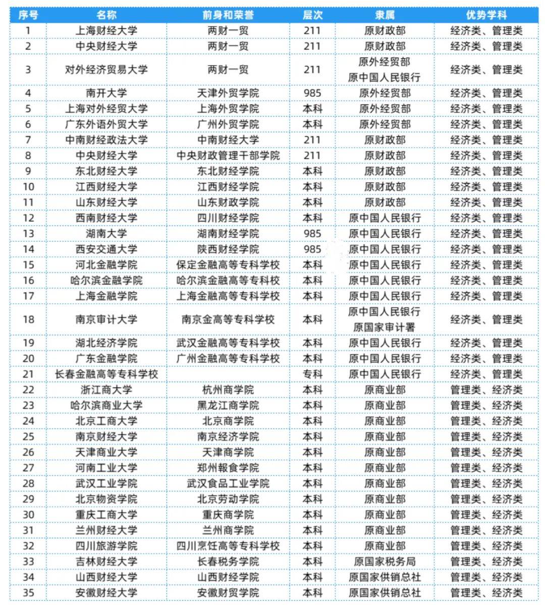 经济管理类相关院校共有35所,层次、隶属及优势学科等具体信息可以参考下表~