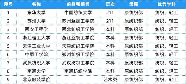 纺织部相关院校共有9所,层次、隶属及优势学科等具体信息可以参考下表~