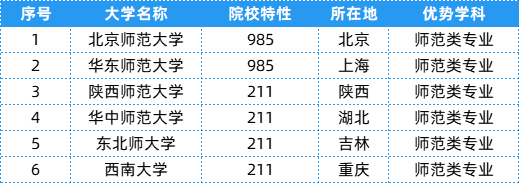 师范类:汉语言文学、数学与应用数学、英语、物理学、化学、生物科学、历史学、地理科学、心理学、计算机科学与技术、思想政治教育、体育教育、音乐学、美术学