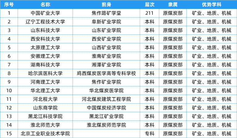 煤炭部相关院校共有15所,层次、隶属及优势学科等具体信息可以参考下表~