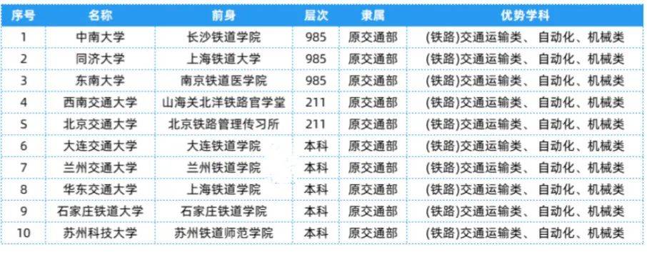 铁道部相关院校共有10所,层次、隶属及优势学科等具体信息可以参考下表~