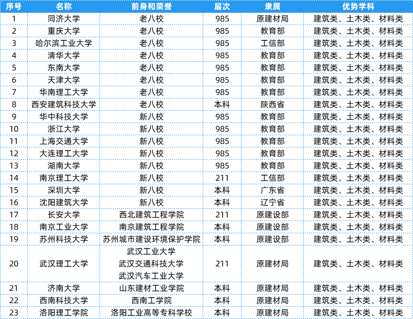 建筑类相关院校共有23所,层次、隶属及优势学科等具体信息可以参考下表~